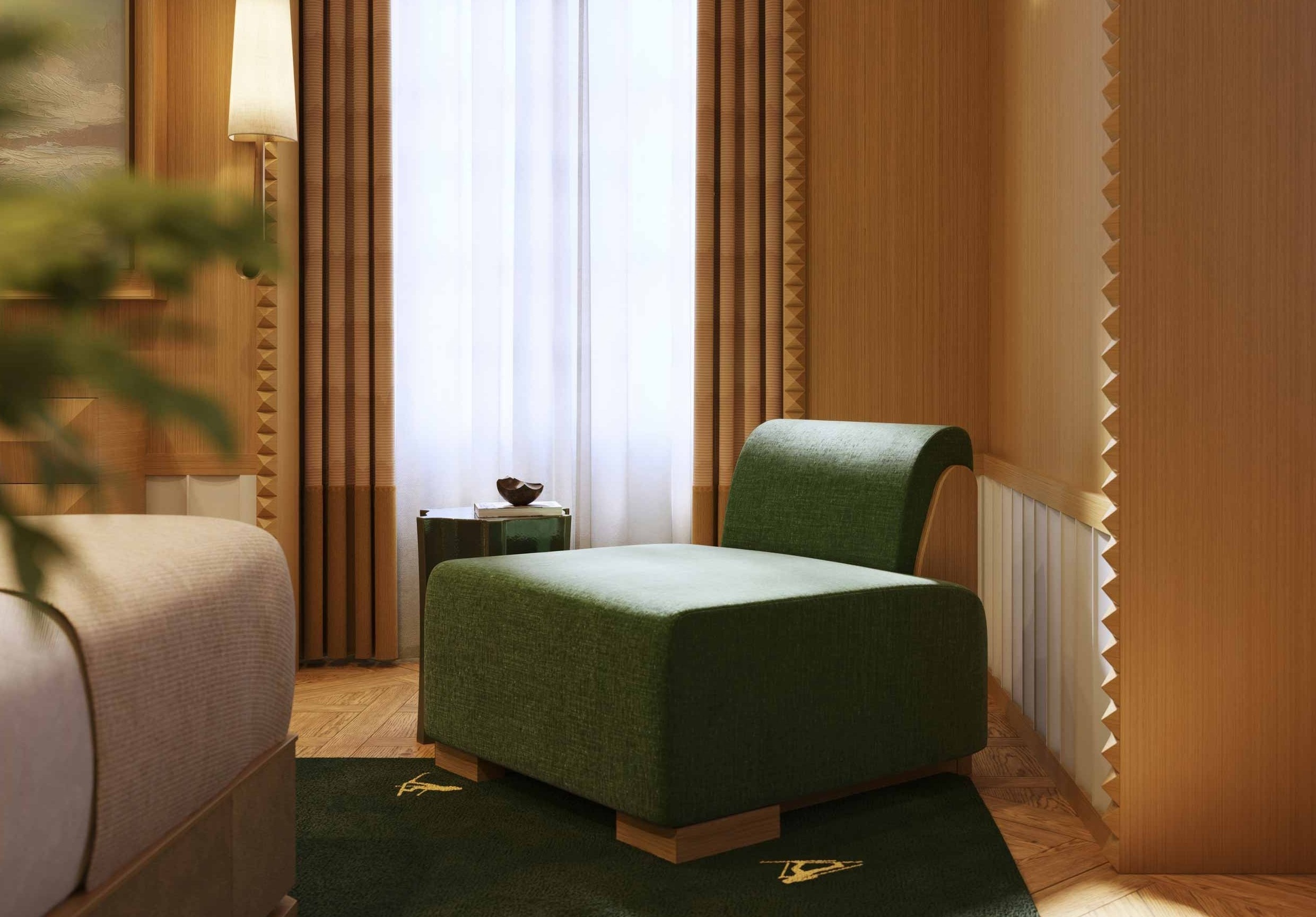 Here, the ambiance unfolds from a dialogue between design and emotion, offering an unbroken panorama that feels cinematic, enveloping, and deeply transporting. Each room is conceived as a private sanctuary, sculpted for stillness, reflection, and rest. Achille Salvagni’s palette of deep woods, jewel-toned velvets, and softly diffused light shapes an atmosphere that feels both intimate and quietly theatrical, an expression of contemporary Italian artistry.