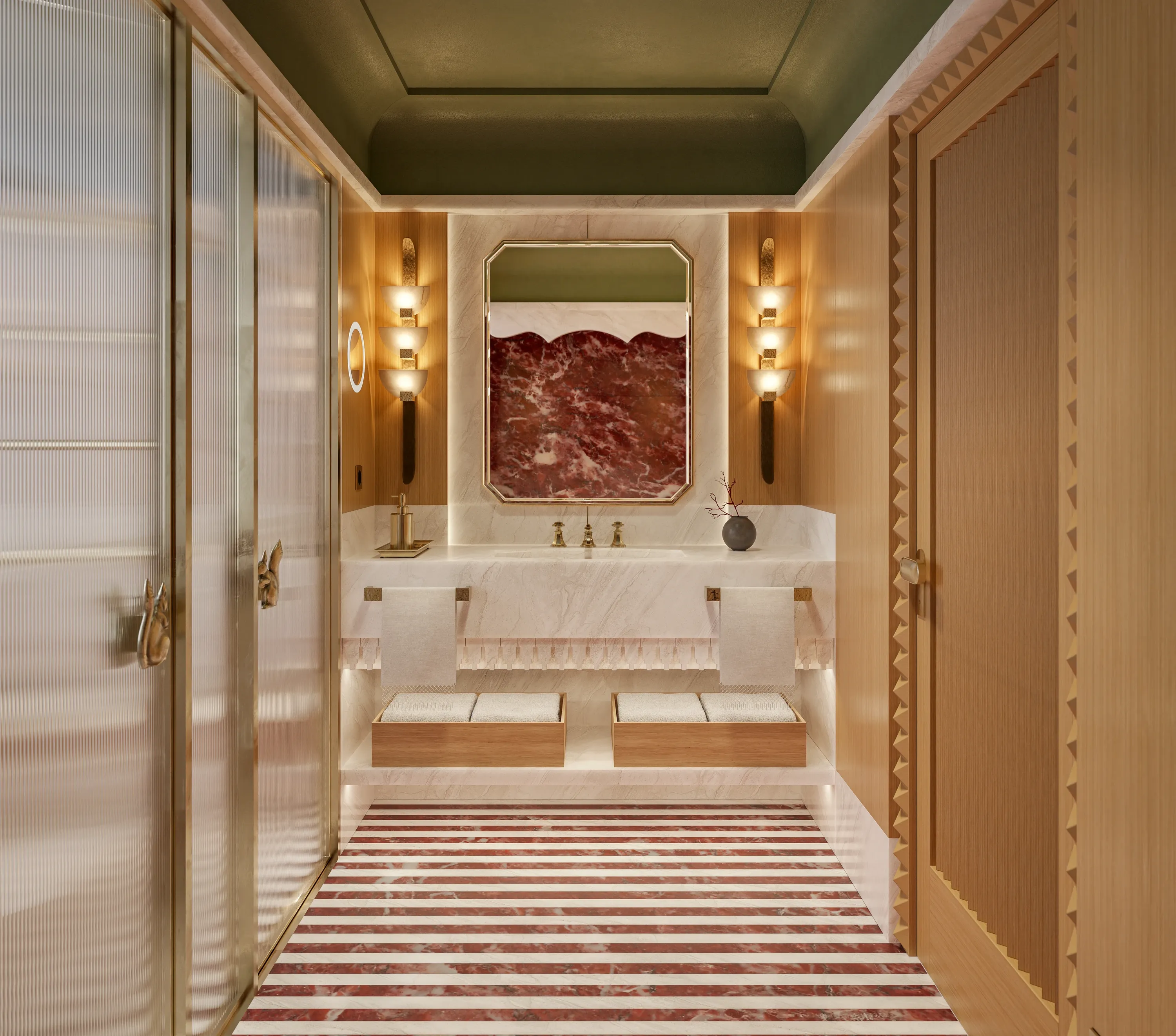 Here, design unfolds in every choice, from the “Versailles” parquet flooring that welcomes your steps, to the meticulous selection of furnishings that define a dedicated living area for pure relaxation. It is an environment where tranquility invites pause, in lounges of enveloping comfort and bedrooms that promise rejuvenating rest, graced with sumptuous king size beds. The Murano chandeliers capture natural light, creating evocative plays of chiaroscuro in harmony with the surrounding red ambiance. Each suite is an invitation to contemplate the extraordinary beauty that surrounds it, with views that embrace the iconic Cortina valley and the majesty of the Dolomite peaks.